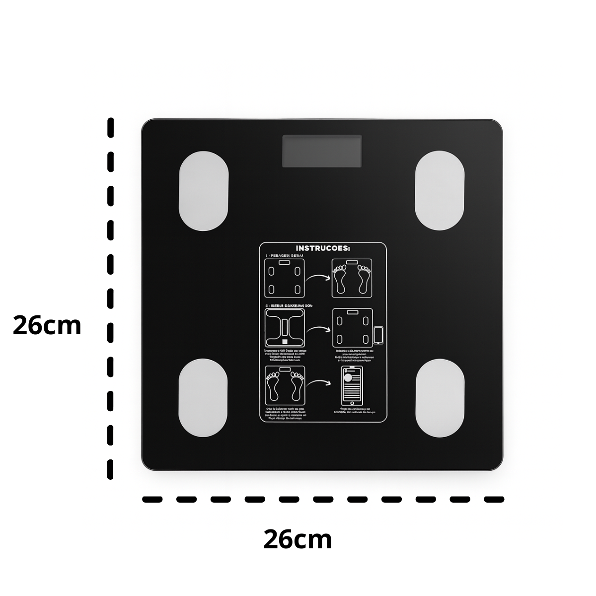 Modo de uso ou Instruções de cuidado: Utilizar sempre descalço para ativar corretamente os sensores, manter em superfície plana, conectar ao aplicativo indicado para iniciar a pesagem e limpar com pano macio sem produtos abrasivos.