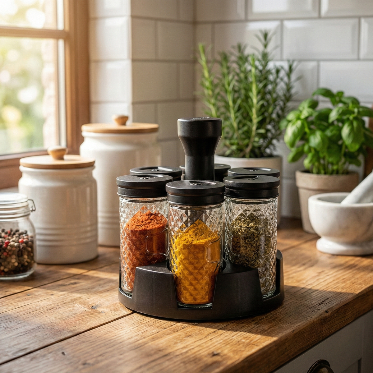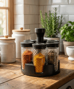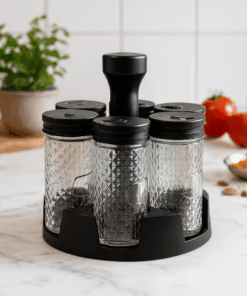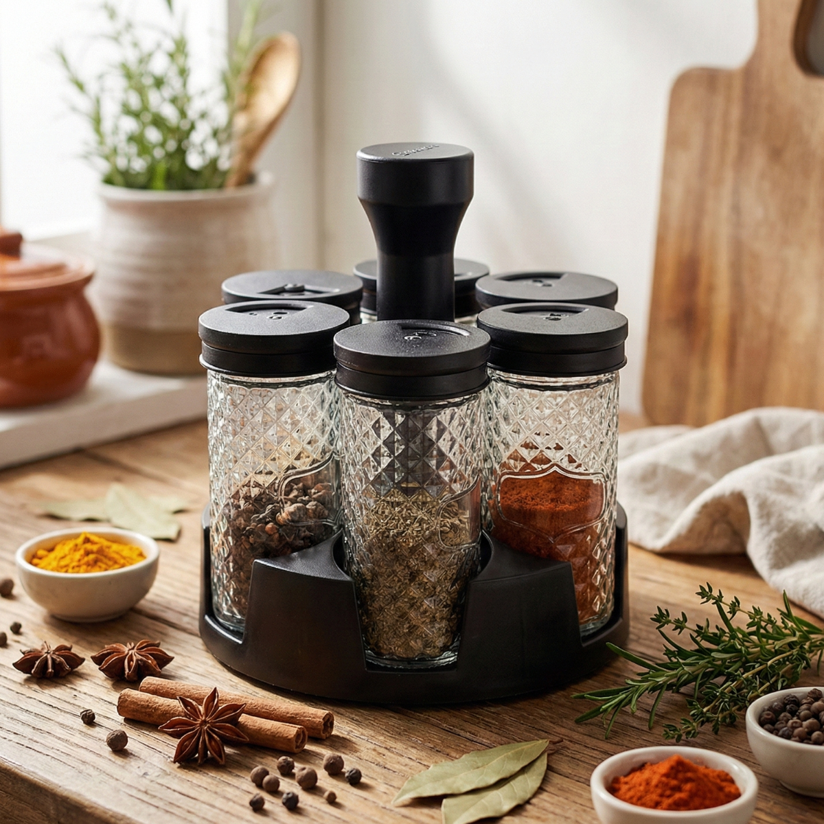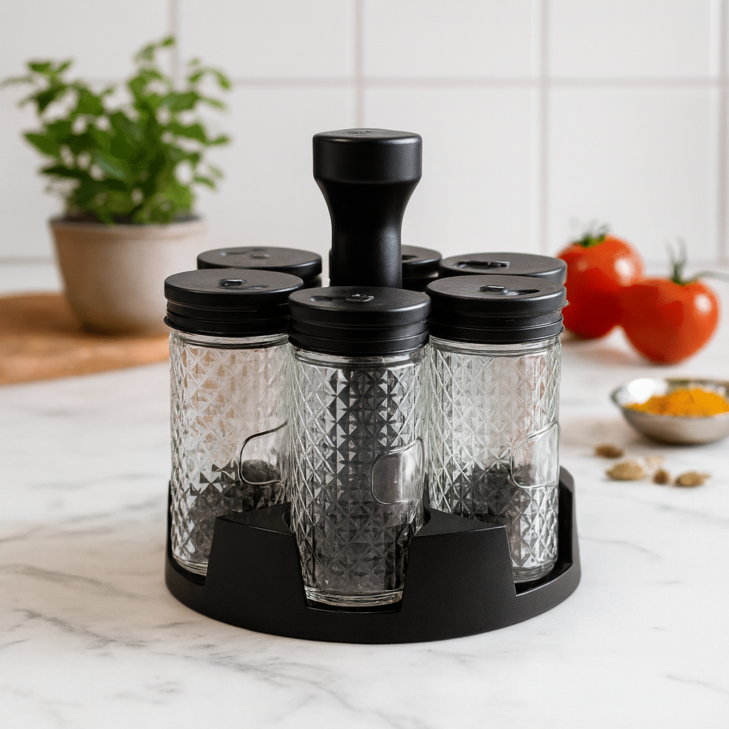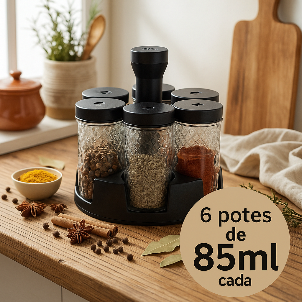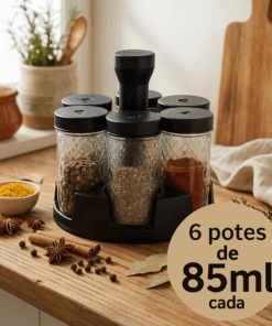 Com design moderno e acabamento impecável, o conjunto inclui um suporte giratório, permitindo visualizar e acessar rapidamente todos os temperos. A rotação suave facilita o uso durante o preparo de refeições, tornando o produto perfeito para quem busca mais agilidade e organização.