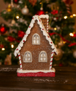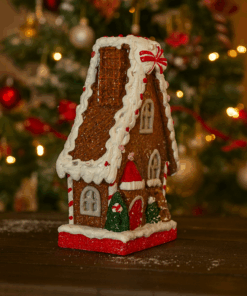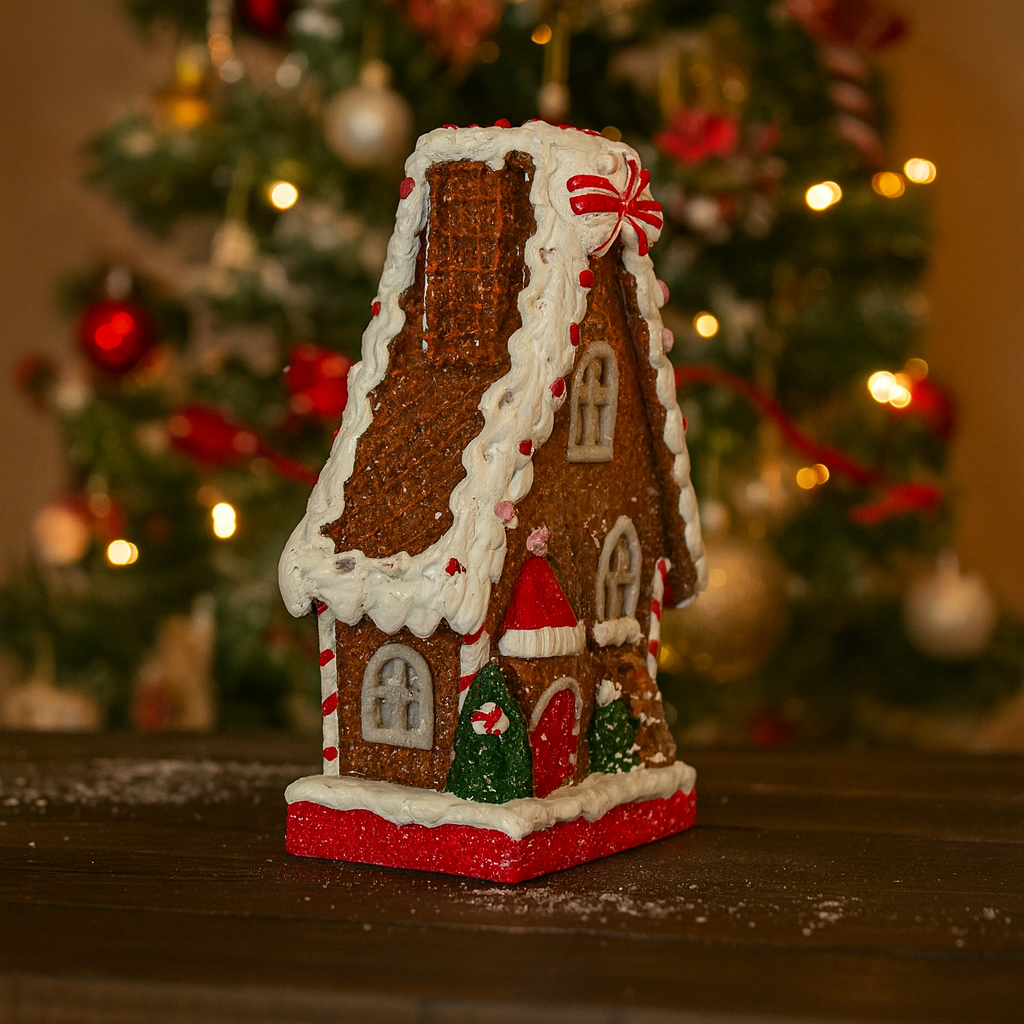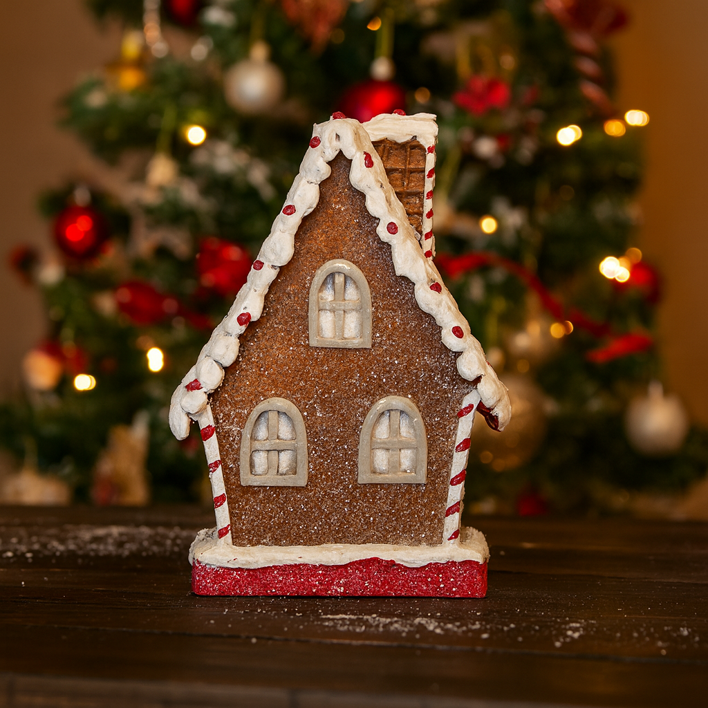 Produzida em resina de alta qualidade, a casinha apresenta pintura delicada e acabamento com efeito de glacê branco, simulando neve sobre o telhado e as bordas. Cada detalhe foi cuidadosamente esculpido: janelas decoradas com listras vermelhas e brancas, porta em estilo natalino, mini boneco de gengibre e elementos doces que completam o visual encantador.