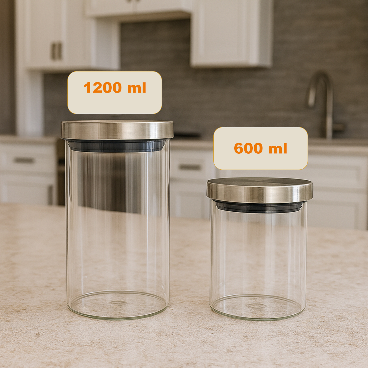 O conjunto é composto por 2 potes de 600 ml (9,5 cm de diâmetro x 11 cm de altura) e 2 potes de 950 ml (9,5 cm de diâmetro x 16 cm de altura), oferecendo tamanhos ideais para armazenar desde grãos e farinhas até biscoitos, temperos e snacks.