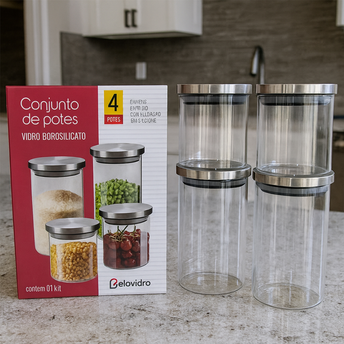 Conjunto 4 Potes de Vidro Tampa Inox Belovidro