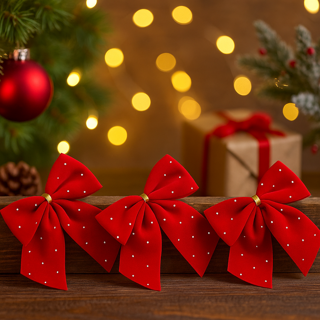 Com 11 cm de largura, cada laço apresenta um vermelho intenso que transmite charme e sofisticação, enquanto os delicados strass aplicados conferem um toque de luminosidade sutil e refinado. Perfeito para decorar árvores de Natal, guirlandas, cestas, presentes, arranjos florais e trabalhos manuais, é uma opção versátil e prática para diversas ocasiões.