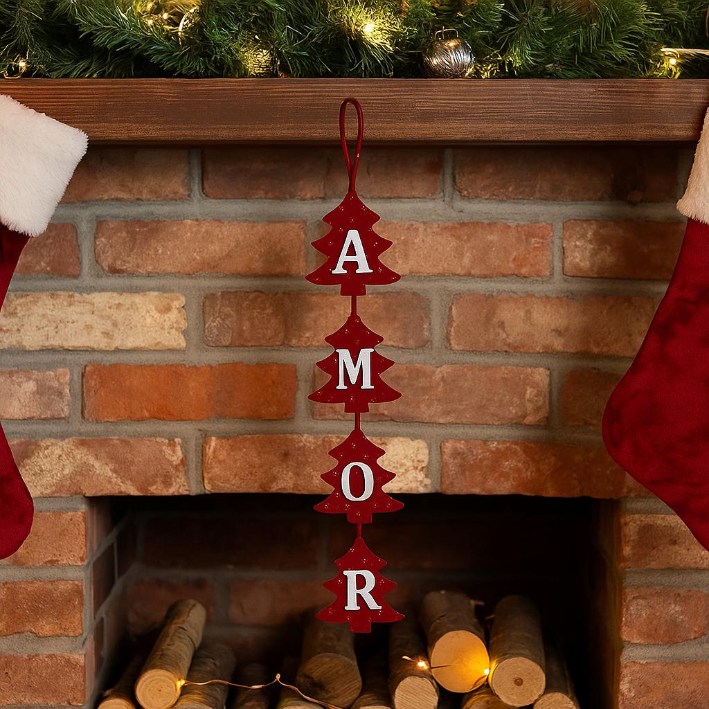 Com 48cm de altura e 9cm de largura, o enfeite apresenta quatro pequenas árvores de Natal dispostas verticalmente, formando a palavra Amor em letras brancas que se destacam sobre o fundo vermelho. O design simples, mas cheio de emoção, traz um toque acolhedor e elegante, perfeito para deixar o ambiente mais festivo e convidativo.
