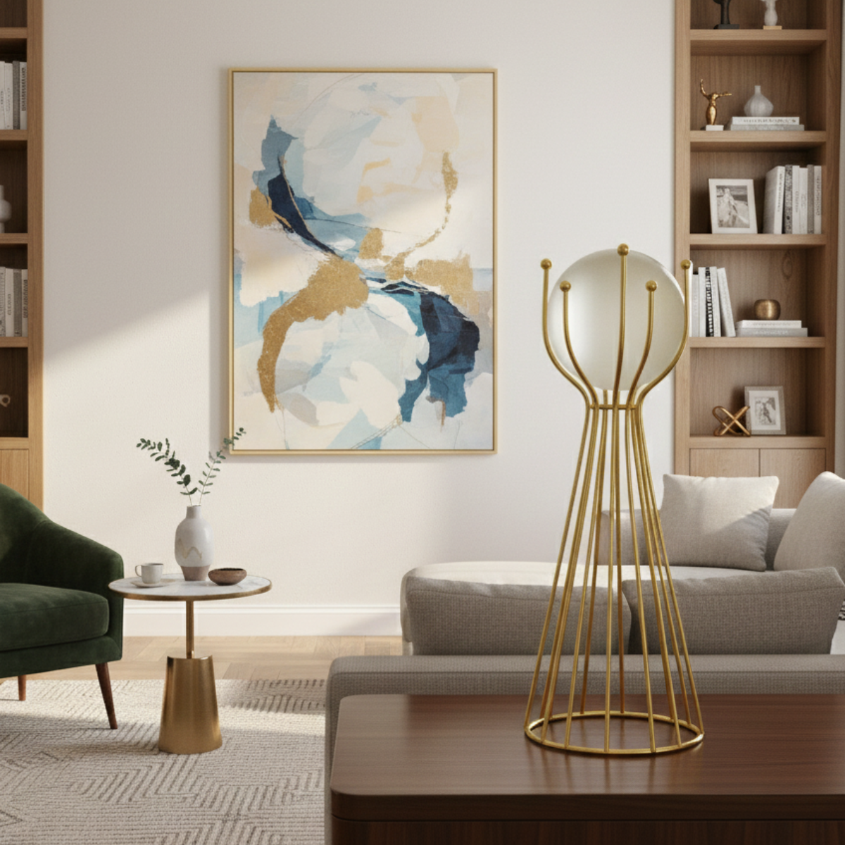 Elegância contemporânea com estrutura de decoração metálica dourada.
