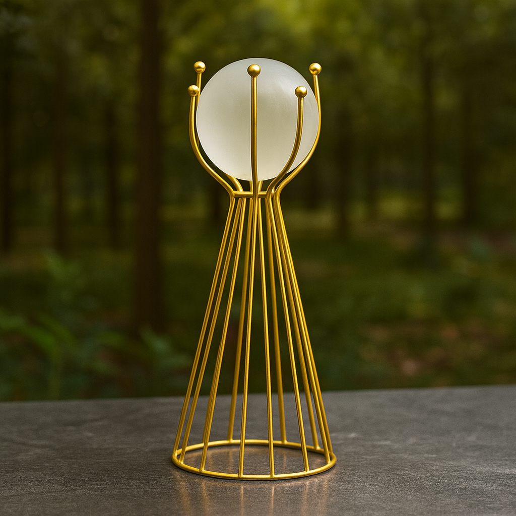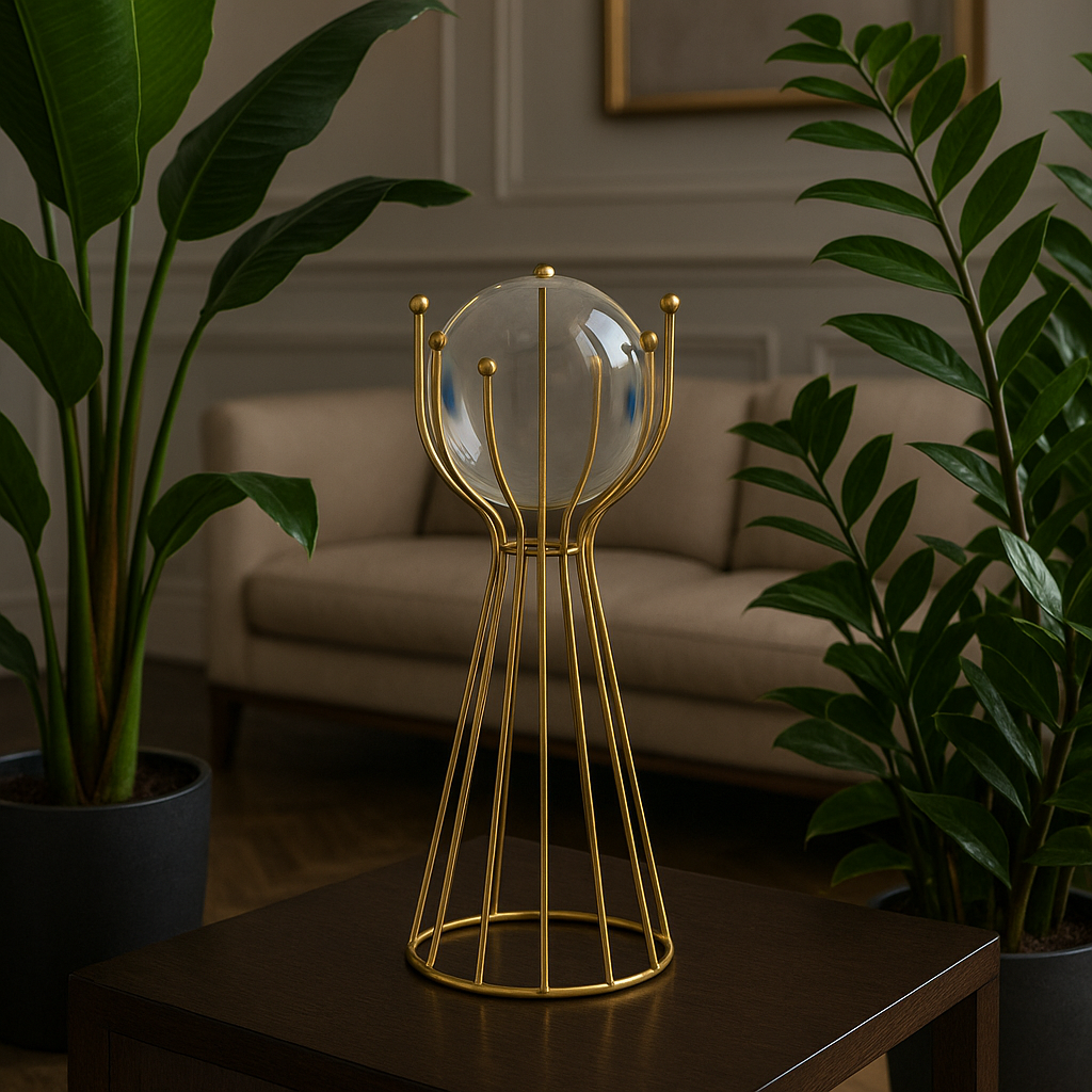 Globo de Vidro e Base de Ferro Decorativa Moderna é a escolha ideal para quem busca uma peça sofisticada, resistente e versátil para valorizar qualquer ambiente. Composto por um globo de vidro transparente apoiado em uma estrutura de decoração metálica dourada, o item combina elegância e durabilidade, tornando-se perfeito para salas, escritórios, hall de entrada ou espaços de destaque. Sua construção refinada proporciona equilíbrio visual, enquanto o design moderno adiciona personalidade e charme à composição, funcionando como ponto focal decorativo em mesas, aparadores ou prateleiras.