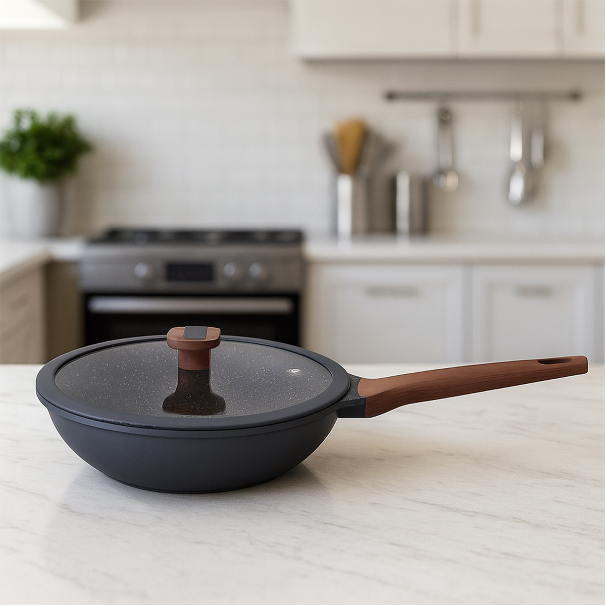 Todas as peças contam com revestimento antiaderente de alta performance, que evita que os alimentos grudem e facilita a limpeza. O acabamento externo na cor Titanium traz elegância à cozinha, enquanto os cabos e alças anatômicos e antitérmicos garantem conforto e segurança no manuseio.