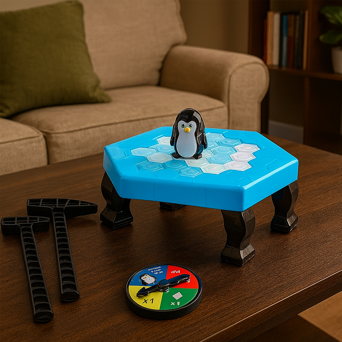 O objetivo é simples e empolgante: evitar que o pinguim caia enquanto os blocos de “gelo” vão sendo removidos um a um. Cada jogador gira a roleta e retira o bloco indicado, com cuidado para não derrubar o pinguim que está no centro da base. Quem fizer o pinguim cair, perde a rodada!