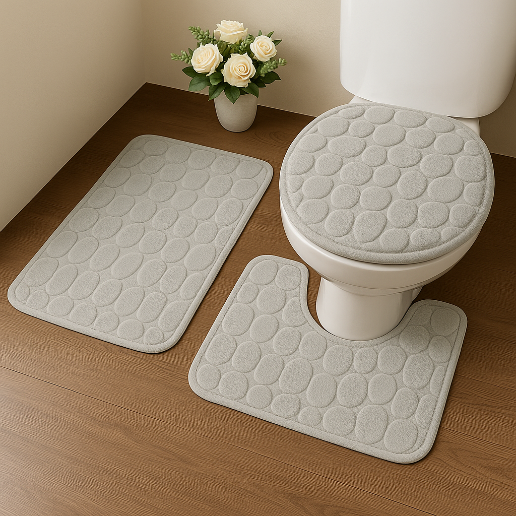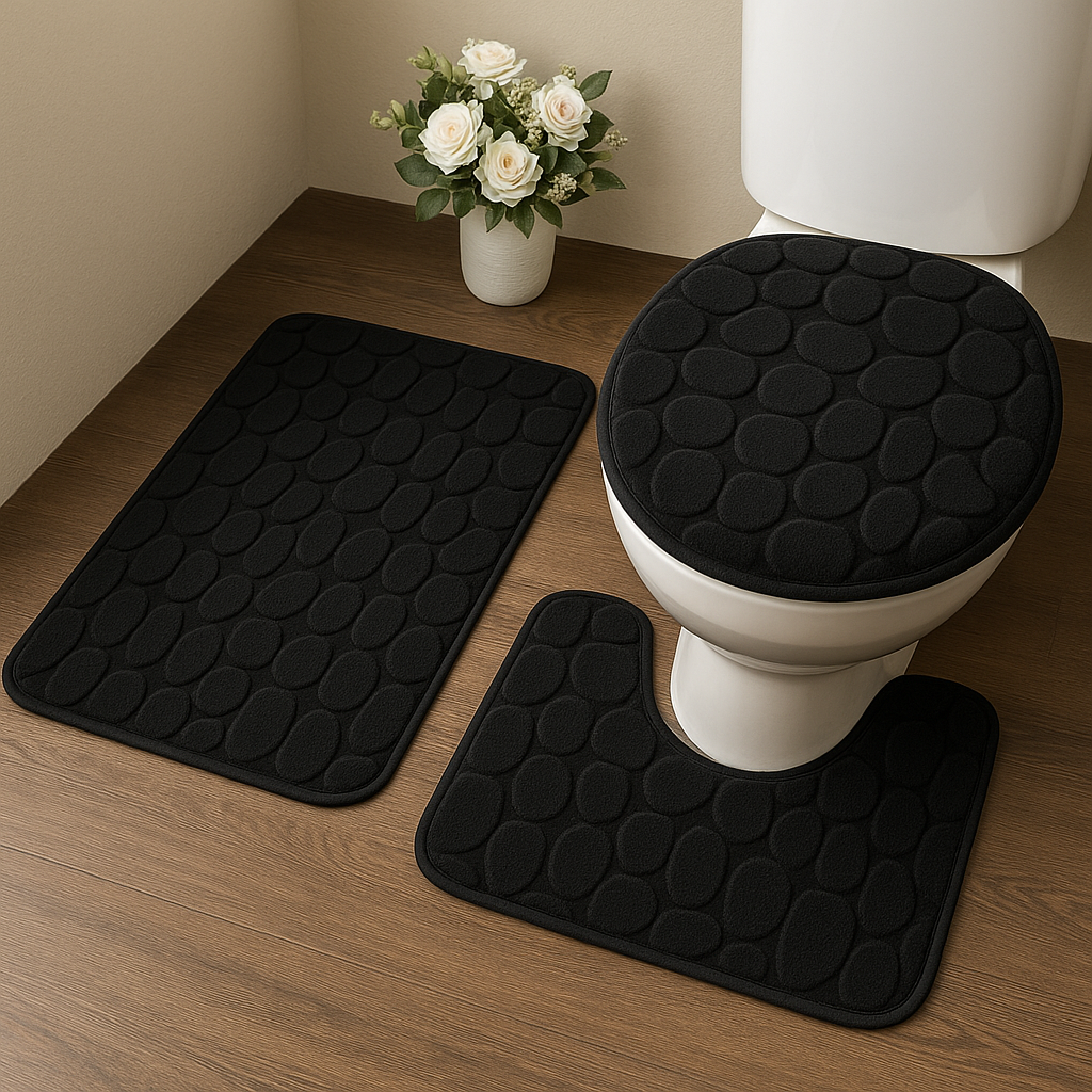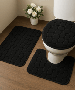 O jogo é composto por três peças: um tapete retangular (40×60 cm), um tapete em formato U para o vaso sanitário e uma capa para a tampa do vaso. Perfeito para banheiros residenciais, lavabos e suítes, o conjunto harmoniza facilmente com diferentes estilos de decoração, disponível em cores modernas como azul, cinza e preto.