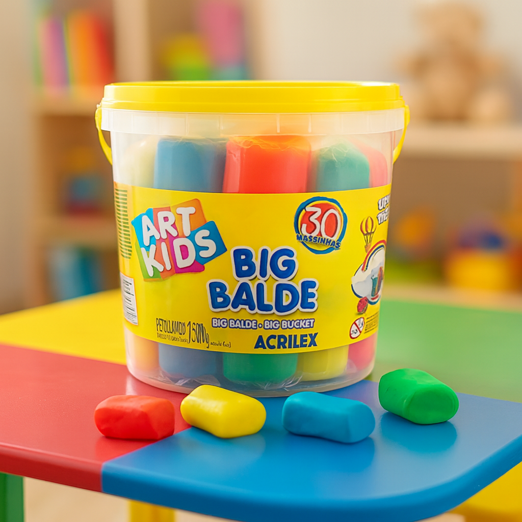 Praticidade e Organização: O balde de plástico resistente facilita o armazenamento e o transporte das massinhas.