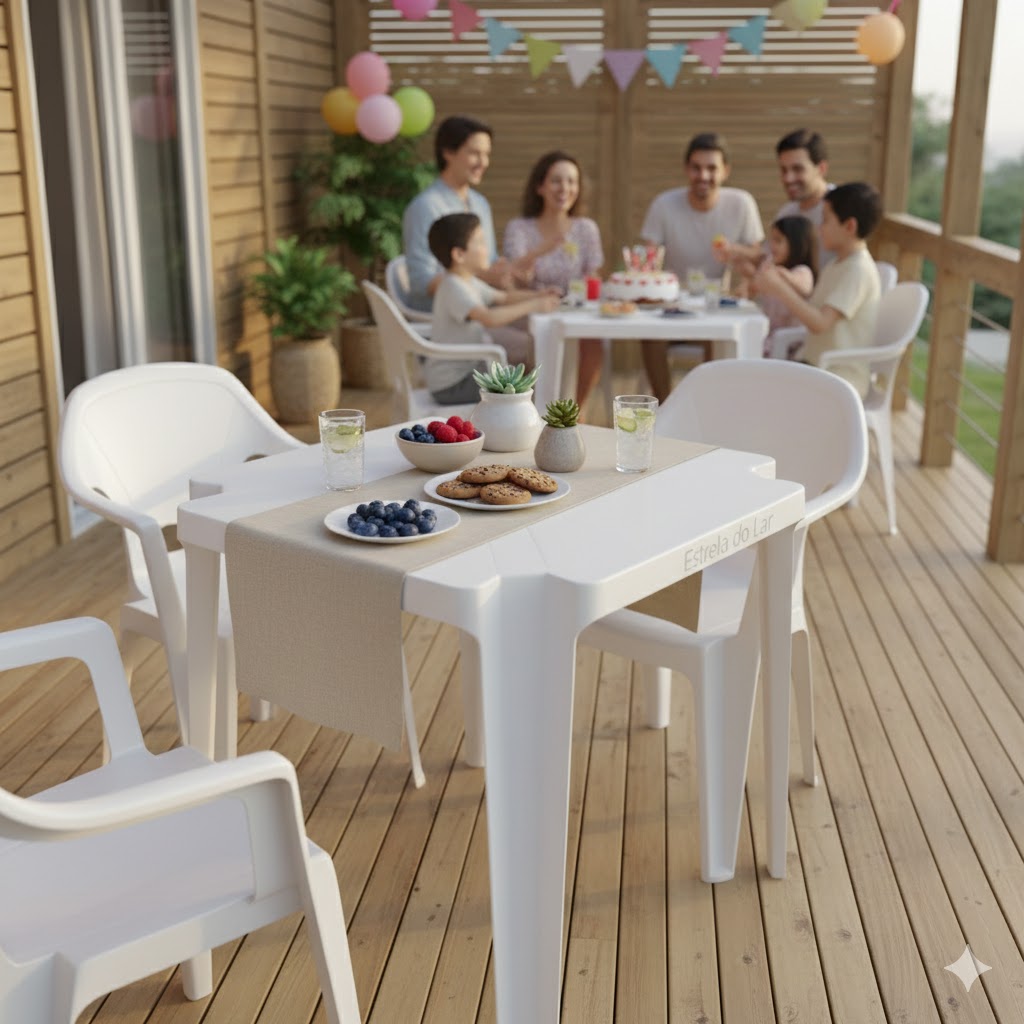 Fabricada em plástico de alta qualidade, esta mesa oferece excelente resistência às intempéries, suportando sol e umidade sem perder a cor ou a estrutura com facilidade. A superfície lisa facilita a higienização: basta água e sabão neutro para remover resíduos e deixá-la pronta para o próximo uso em poucos minutos.