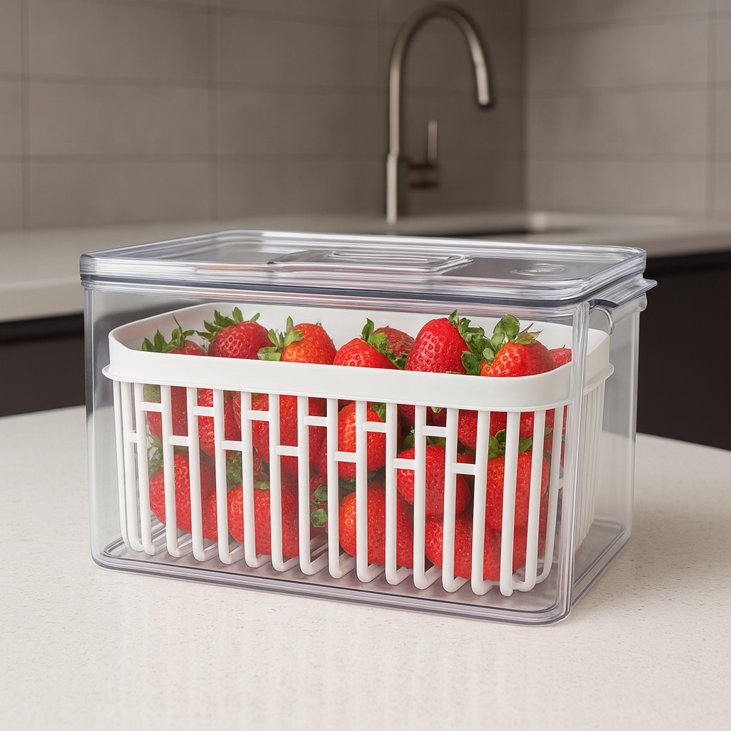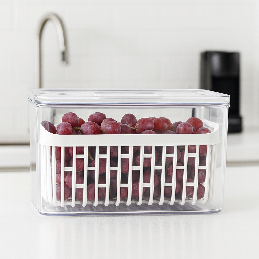 O Organizador de Geladeira com Cesto Coza proporciona uma conservação prática e eficiente, mantendo frutas, verduras e legumes frescos por mais tempo graças ao seu sistema com tampa que pode ser usada aberta para ventilação ou fechada para maior proteção. Organizador de Geladeira Transparente com Cesto o Feito em material resistente e transparente, facilita a visualização dos alimentos, enquanto o cesto interno permite a drenagem de líquidos, evitando umidade excessiva. Ideal para organizar e otimizar espaços na geladeira, é um recipiente versátil para o dia a dia.