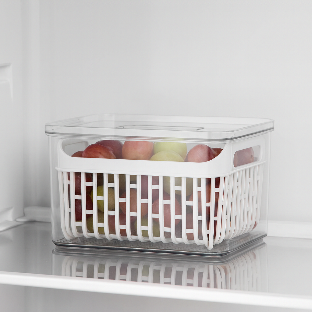 Organizador de Geladeira Transparente com Cesto com tampa ventilada ou fechada para conservar alimentos por mais tempo