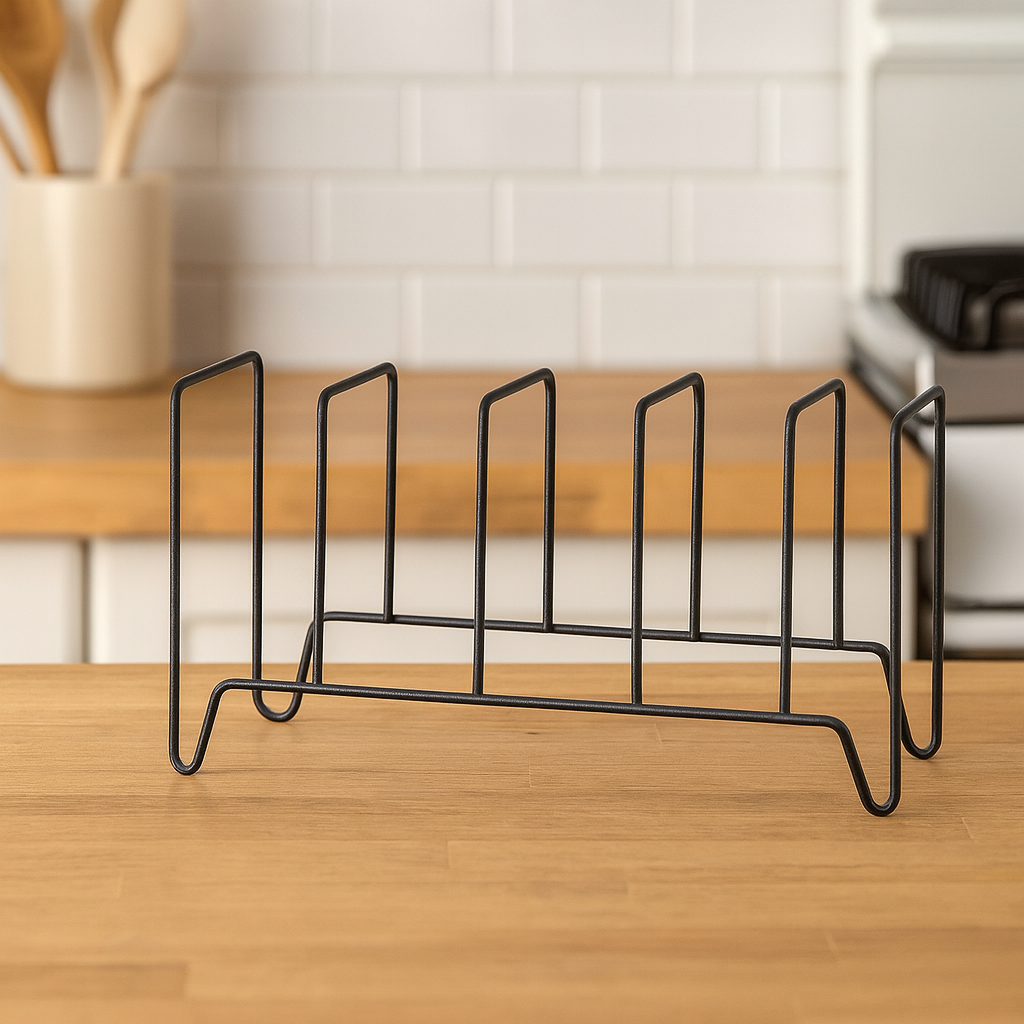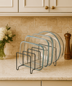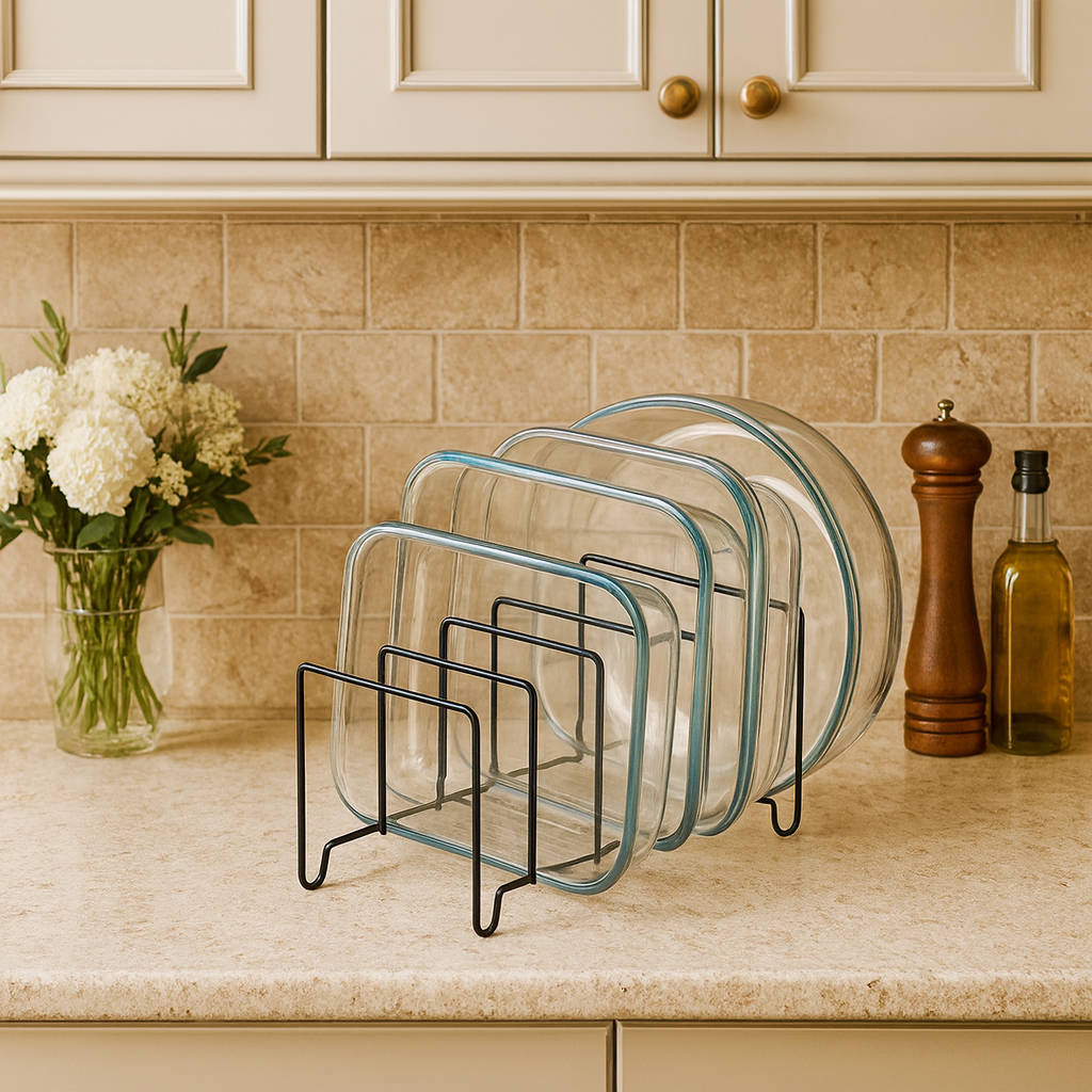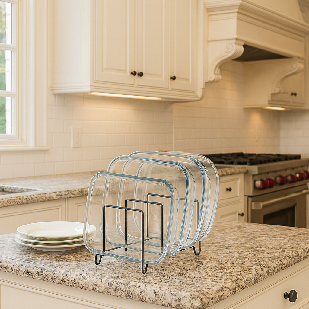 O suporte cromado mantém suas travessas sempre acessíveis e bem acomodadas.